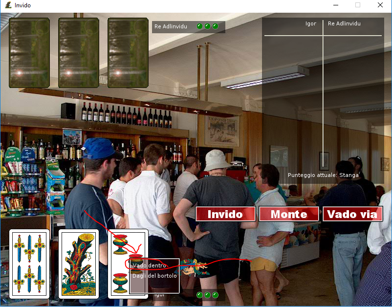 Finalmente la nuova versione del gioco dell’Invido che ora supporta la funzione “Vado Dentro”. Basta usare il tasto destro sulla carta con la quale si vuole andare dentro. Ora il gioco dell’Invido è completo in tutte le funzionalità ed è ancora più forte. Per la nuova versione ho fatto una revisione del codice sorgente, aggiornando la libreria SDL alla versione 2.0. Sempre col tasto destro è possibile invitare il computer a chiamare di più, oppure dargli del ‘bortolo’. Se poi questo invito viene accettato è tutto da provare. Maggiori informazioni sul progetto del gioco dell’Invido si trovano su Progetto Invido. Ho cambiato anche la musica in sottofondo pesscando una tra le più belle performance registrate della leggenda bredese Wolmer Beltrami.